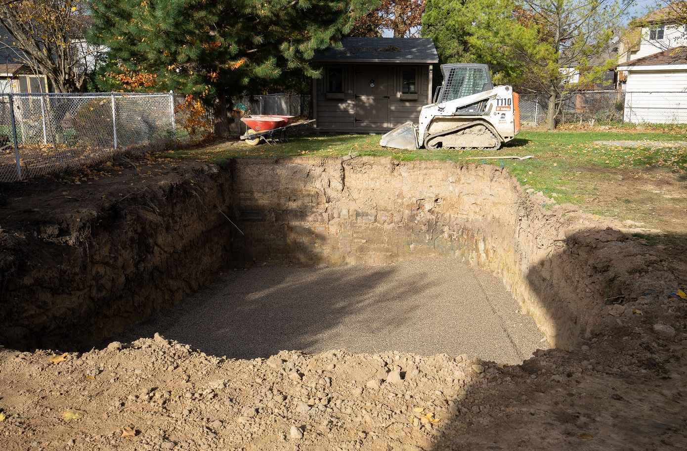 The pool is filled with water and the backfill process begins